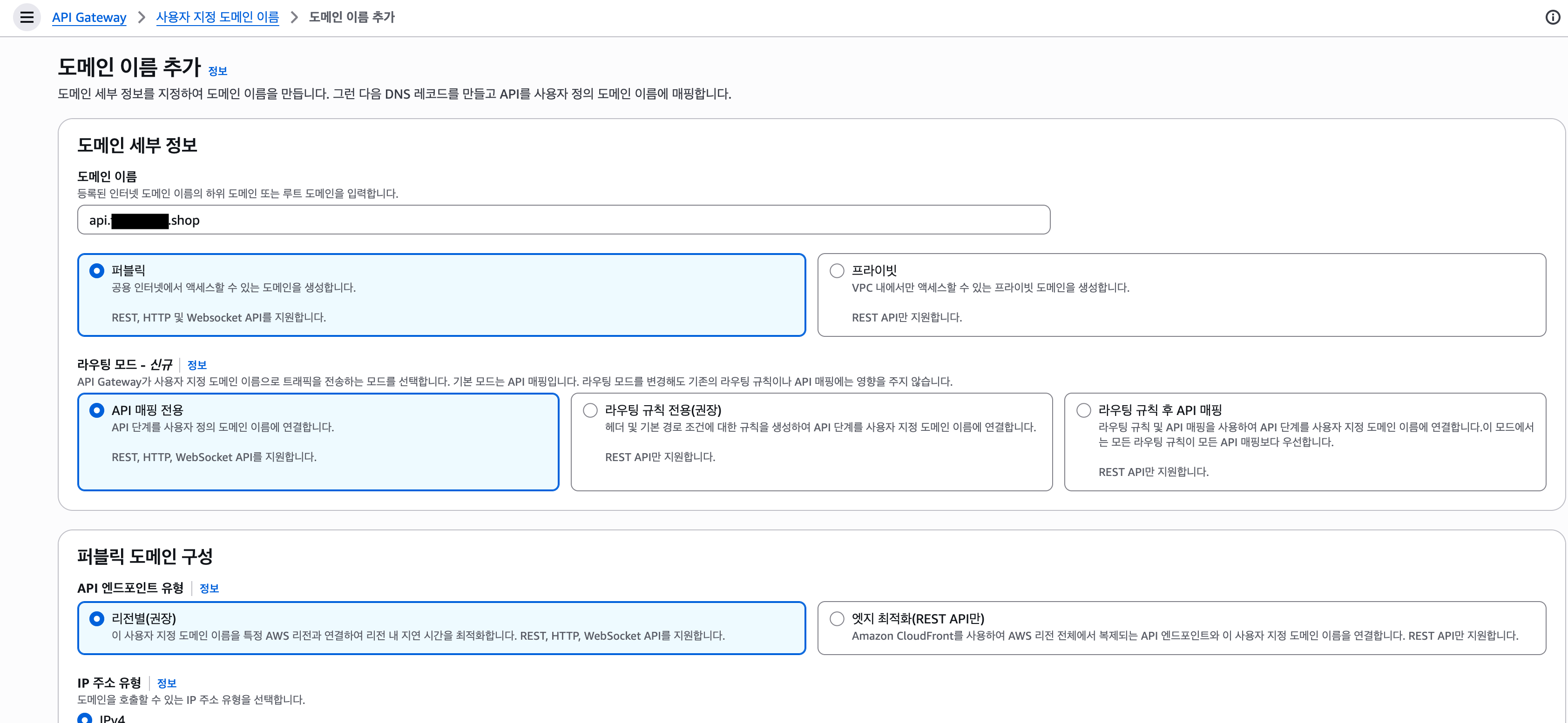 그리고 라우팅 대상으로 커스텀 도메인의 API Gateway 도메인이름으로 해준다.
